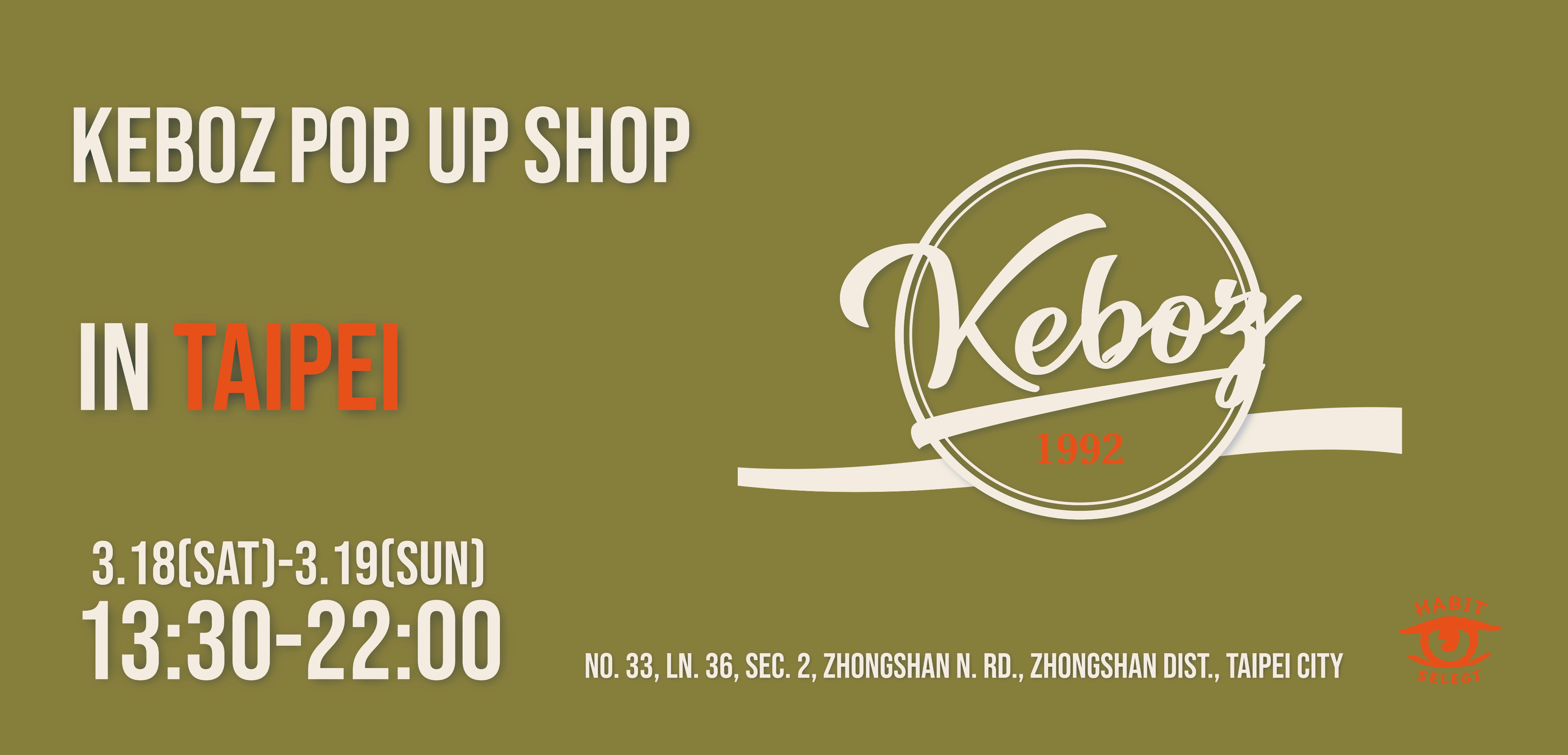 首次海外快閃店將在HABIT SELECT舉辦,HABIT與KEBOZ的海外限定聯名商品也正在如火如荼的準備中,除了聯名商品外還準備新一季春夏全新商品與各位見面。